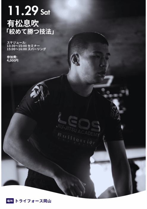 元TF岡山会員にして、現在は広島のレオス柔術アカデミー所属の有松息吹選手のセミナーを開催いたします!